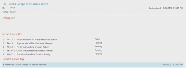 In preparation of a Service Manager 2012 demo for the Pre-TechEd Europe 2012 event , organized by Microsoft, HP and Inovativ I was facing an issue. After submitting a cloud service request through the Service Manager 2012 Self-Service Portal all requests almost instantly failed.