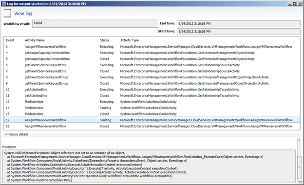 When you drilldown to the workflows status section (Administration\Workflows\Status) and filter on cloud you’re able to find the faulting workflow which is related to the service request, in our case the Assign Virtual Machine Reviewer. (see also Troubleshooting Workflows in Service Manager for addtional throubleshooting tips)