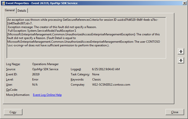 As sometimes error messages can be somewhat cryptically, a good next troubleshooting step is the Operations Manager eventlog. When searching the Operations Manager eventlog within the time range when the service request was failing Event 26319 got my attention. As you can see we found the root cause of our problem.