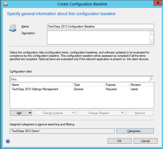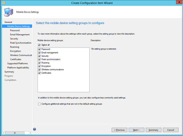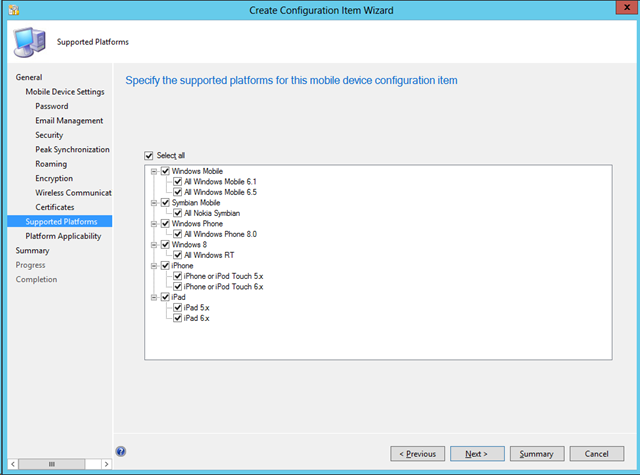 In order to apply settings management you’ll create a Configuration Item (CI). A CI contains configuration and associated validation criteria to be assessed for compliance on devices. With Configuration Manager 2012 SP1 you can specify different different platforms to target configuration items: