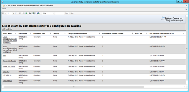 Configuration Manager 2012 SP1 provides (17) build-in reports which provides clearly reports regarding compliance, non-compliance status and remediation of your mobile devices.