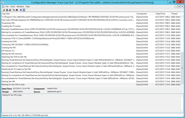 - To have a closer look of the VHD creation process use the DeployToVHd.log which is depending where you installed the console – by default located at ‘C:\Program Files (x86)\Microsoft Configuration Manager\AdminConsole\AdminUILog’