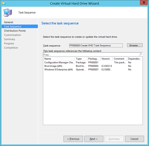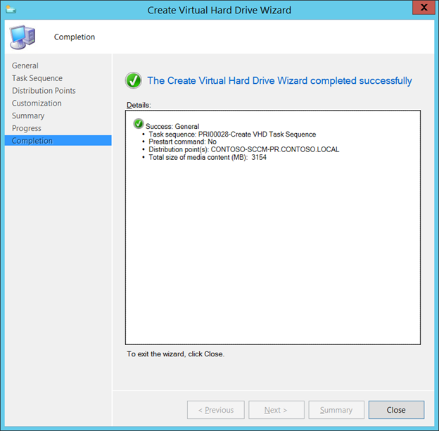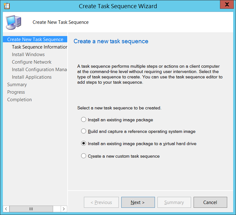 - When finished the Task Sequence we can proceed with the Create Virtual Hard Drive Wizard (only enabled when Hyper-V role is installed on the machine where you are running the Configuration Manager 2012 R2 console).
