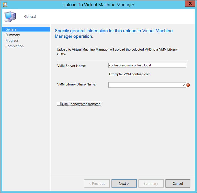 - VMM 2012 SP1/R2 console – Virtual Machine Manager console is required in order to upload VHD’s into VMM.