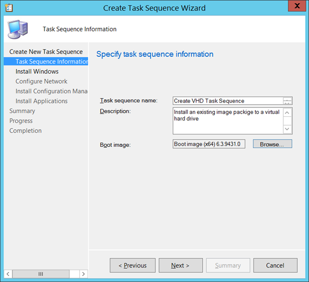 - In preparation of creating a VHD we create first a new Task Sequence based on the new template ‘Install an existing image package to a virtual hard drive’