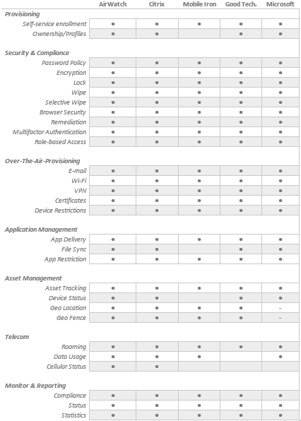 What this product comparison makes complex and challenging is most vendors provides a partial (modular) solution instead of an overall MDM. For example mobile application management (MAM), mobile content management (MCM), mobile email management (MEM) and so on are available as additional components to base MDM functionality.
