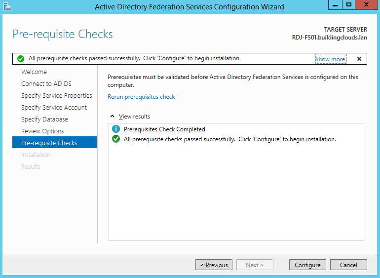 After moving the service account to the Managed Service Accounts container we passed the pre-requisite checks and configured AD FS successfully!