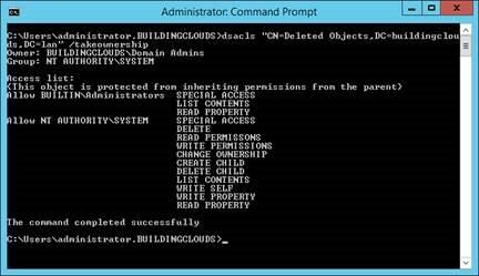 dsacls “CN=Deleted Objects,DC=buildingclouds,DC=lan” /takeownership