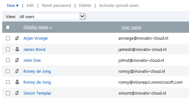 The users in Windows Intune marked by a sync-icon are synchronized from your on-premise Active Directory to off-premise Azure Active Directory.