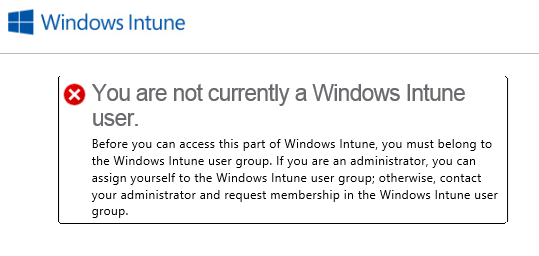 The message below occurs when John Doe logs on to Windows Intune services but hasn’t been granted access to use Windows Intune. In this case step 4 has been missed, John Doe wasn’t added to the Windows Intune collection in Configuration Manager.