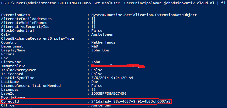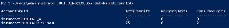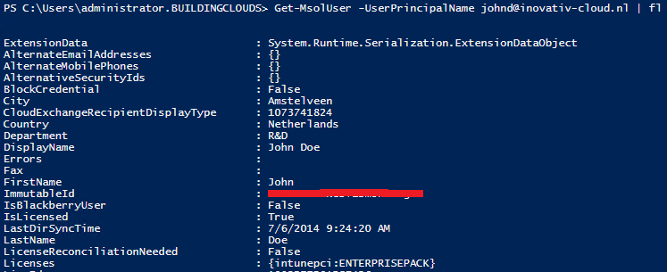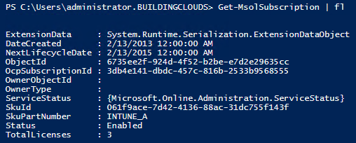 Secondly we added Office 365 E3 license. So retrieving the license information again we’ll see an overview including both Windows Intune and Office 365 (ENTERPRISEPACK).