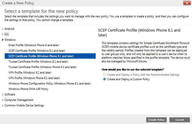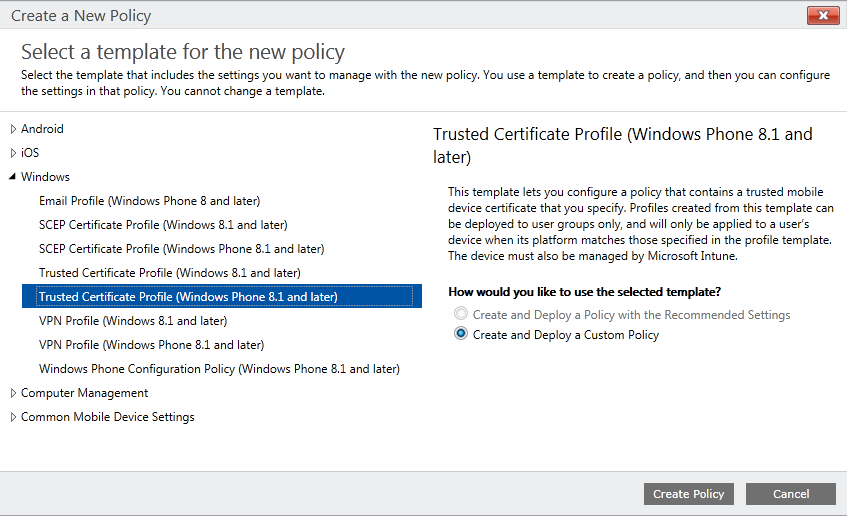• Select Trusted Certificate Profile (Windows Phone 8.1 and later) and click Create Policy