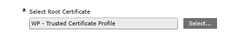 • Select Root Certificate. Click Select to choose a root CA certificate profile that you have previously configured and deployed to the user or device. This CA certificate must be the root certificate for the CA that will issue the certificate that you are configuring in this certificate profile.