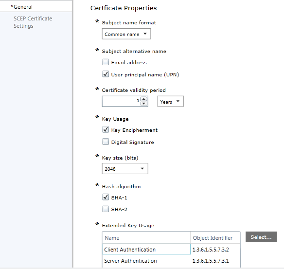 • Extended Key Usage (Click Select to add values for the certificate’s intended purpose. In most cases, the certificate will require Client Authentication so that the user or device can authenticate to a server. However, you can add any other key usages as required)