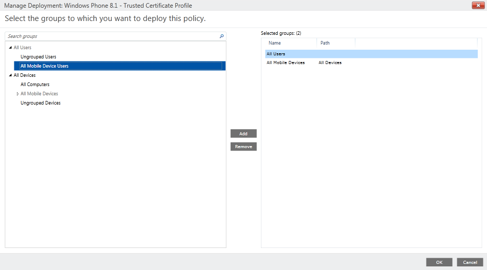 • Deploy the Trusted CA certificate profile policy preferably to a user group (not a device group), as this will allow certificates to be published to the device very quickly after it is enrolled.