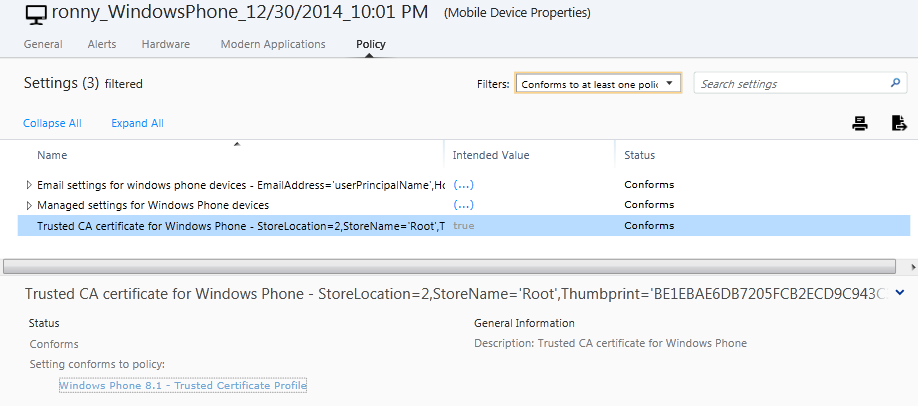 • After refreshing my workplace policy on my Windows Phone device, both Trusted Certificate Profile and SCEP Certificate Profile policy came down to my device.