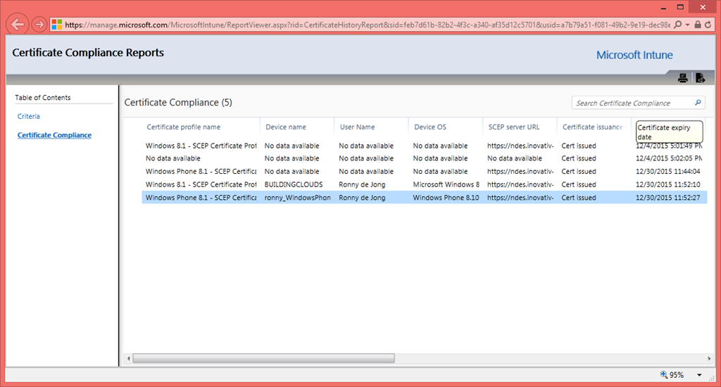Using the Certificate Compliance Reports in Microsoft Intune provides you the possibility to monitor the status of issued certificates and there compliance status.