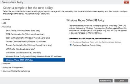 From the Policy pane create a new policy and select Windows Phone OMA-URI Policy template.