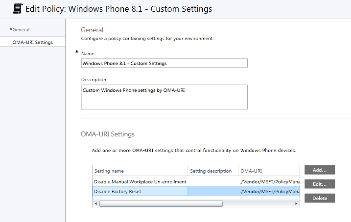 By using these setting you are able to prevent Windows Phones devices in one way or another and not be taken out of management. This simple example shows the power of using OMA-URI! For an overview of all OMA-URI for Windows Phone settings see PolicyManager configuration service provider and Windows Phone 8.1 MDM Protocol documentation.