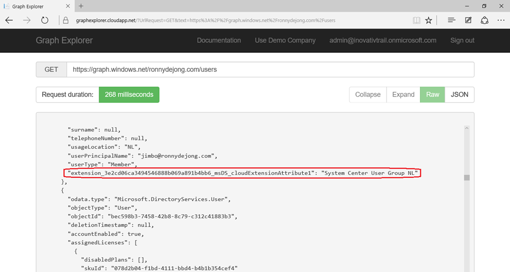 I’m not a dev, so I’m using the Graph Explorer tool to query my Azure AD schema to verify if the selected attribute extension is available. The output from our get query shows us our Azure AD schema is successfully extended with the user attribute msDS-cloudExtensionAttribute1 and is known by “extension_3e2cd06ca3494546888b069a891b4bb6_msDS_cloudExtensionAttribute1″ including the value “System Center User Group NL”.