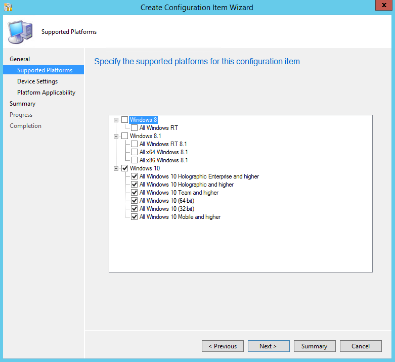 On the Supported Platforms screen, click the Windows 10 box, and then click Next.