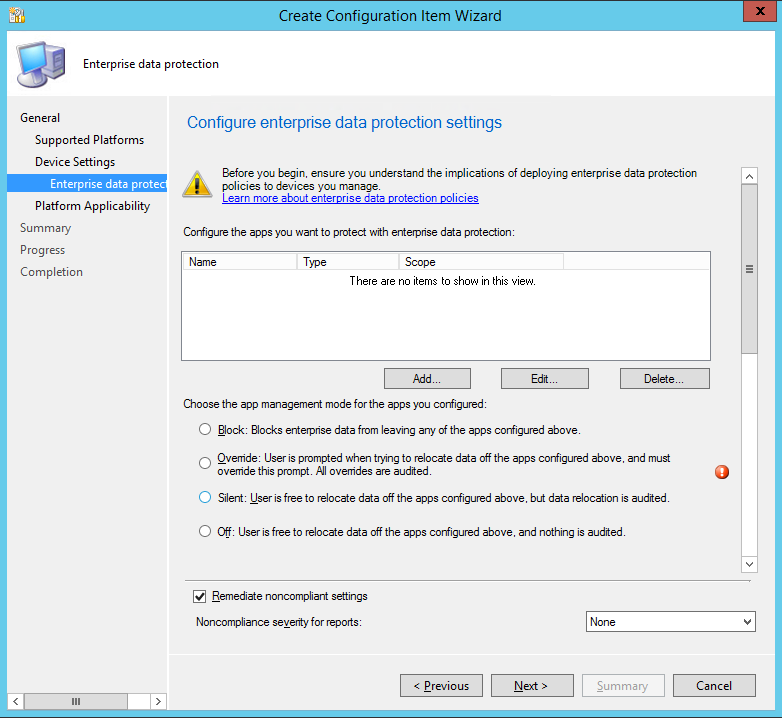 When managing Windows 10 devices, Configuration Manager Current Branch will be able to create and deploy configuration items for Windows 10 enterprise data protection (EDP). EDP helps you restrict and/or alert/audit you to company data sharing/leaking. Configuration Manager EDP configuration items will manage the list of apps protected by EDP, enterprise network locations, protection level, and encryption settings.