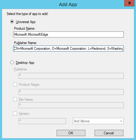Copy the Publisher value and paste them into the Publisher Name box and the Name value into the Product Name box of the Add app box, and then click OK.