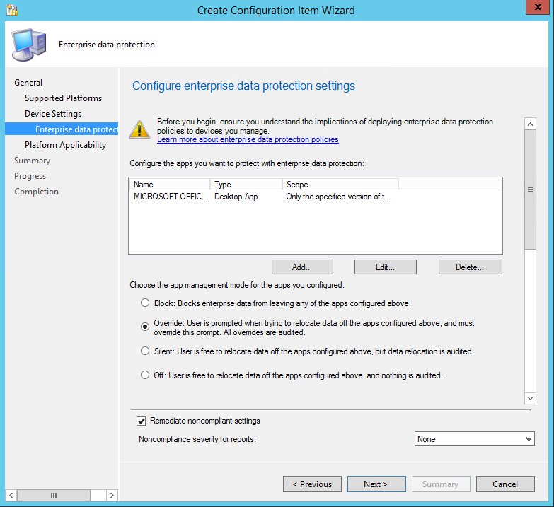 After you’ve added the apps you want to protect with EDP, you’ll need to apply an app management mode. In this example we’re selecting Override.