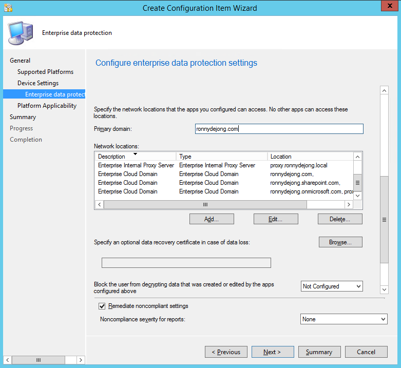 Before we can deploy Enterprise Data Protection policies we need some basic information including protected applications and corporate network locations. This to define which protected apps can access corporate data on corporate network locations. See my previous EDP blog posts Part 1 – Introduction: Windows 10 Enterprise Data Protection – Under the hood… and Part 2 – Define Privileged Desktop & Universal Applications for Enterprise Data Protection how you can define corporate network locations and protected applications.