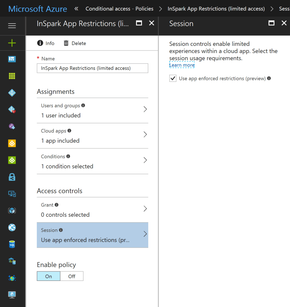 Session controls enable limiting experience within a cloud app. The session controls are enforced by cloud apps and rely on additional information provided by Azure AD to the app about the session. The session controls is in preview and currently available for Office 365 SharePoint Online, OneDrive and Office 365 Groups.