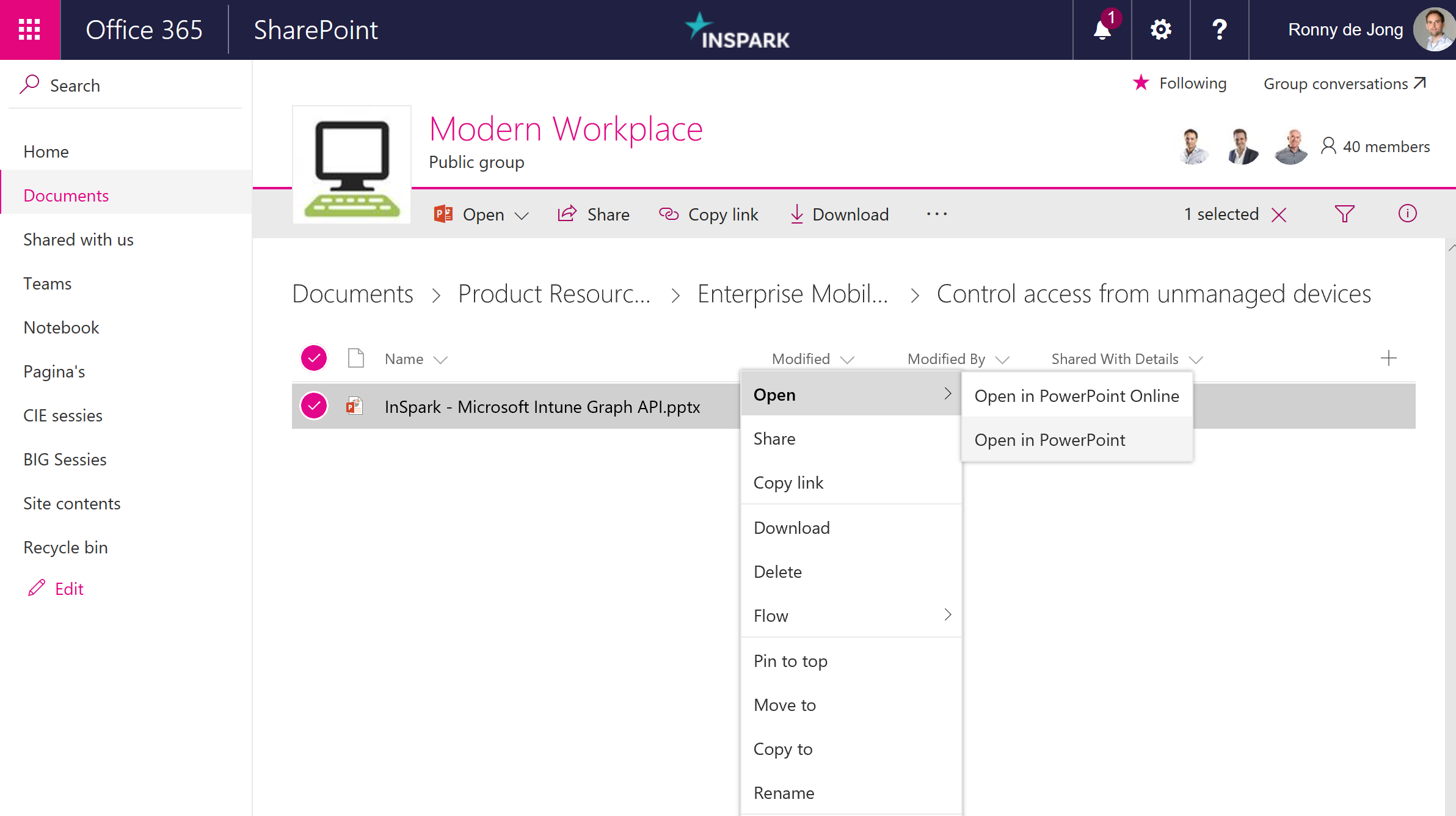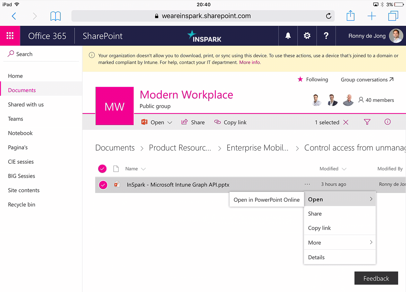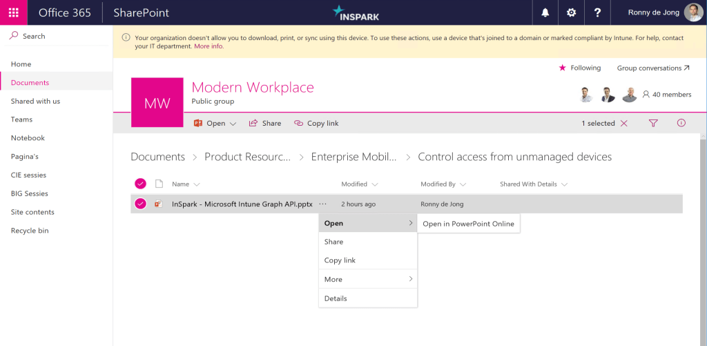 As we excluded Office 365 SharePoint Online as cloud app from our first Conditional Access rule and configured App enforced restrictions we can open SharePoint Online in web based on unmanaged devices. The number of controls is limited to open Office files in Office Online for unmanaged devices.