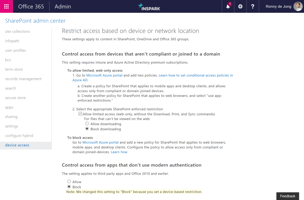 To block access, you’ll set one policy in the Microsoft Azure portal/Microsoft Intune. To limit access (web-only access), you’ll set two policies and select a setting in the SharePoint admin center.