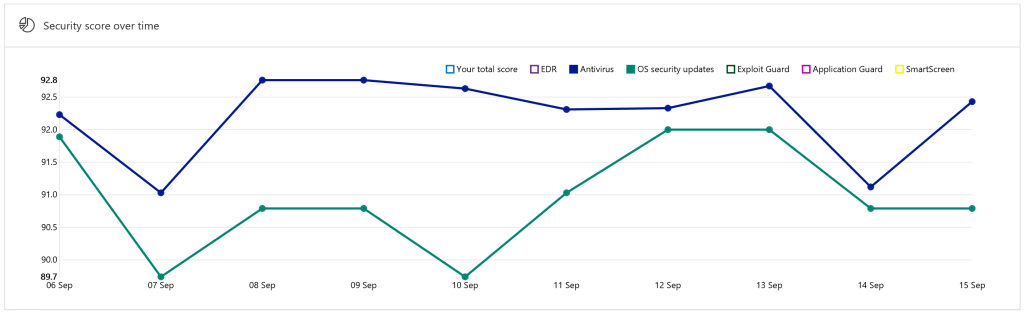 The Security Score over time shows you improvement over time and provides several viewpoints of the catagories being managed.