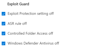 | Defender/AttackSurfaceReductionRules | This policy setting enables setting the state (Block/Audit/Off) for each Attack surface reduction (ASR) rule. Each ASR rule listed can be set to one of the following states (Block/Audit/Off).