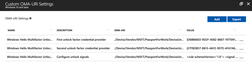 • On the Custom OMA-URI settings blade select Add to add the second unlock credential provider;