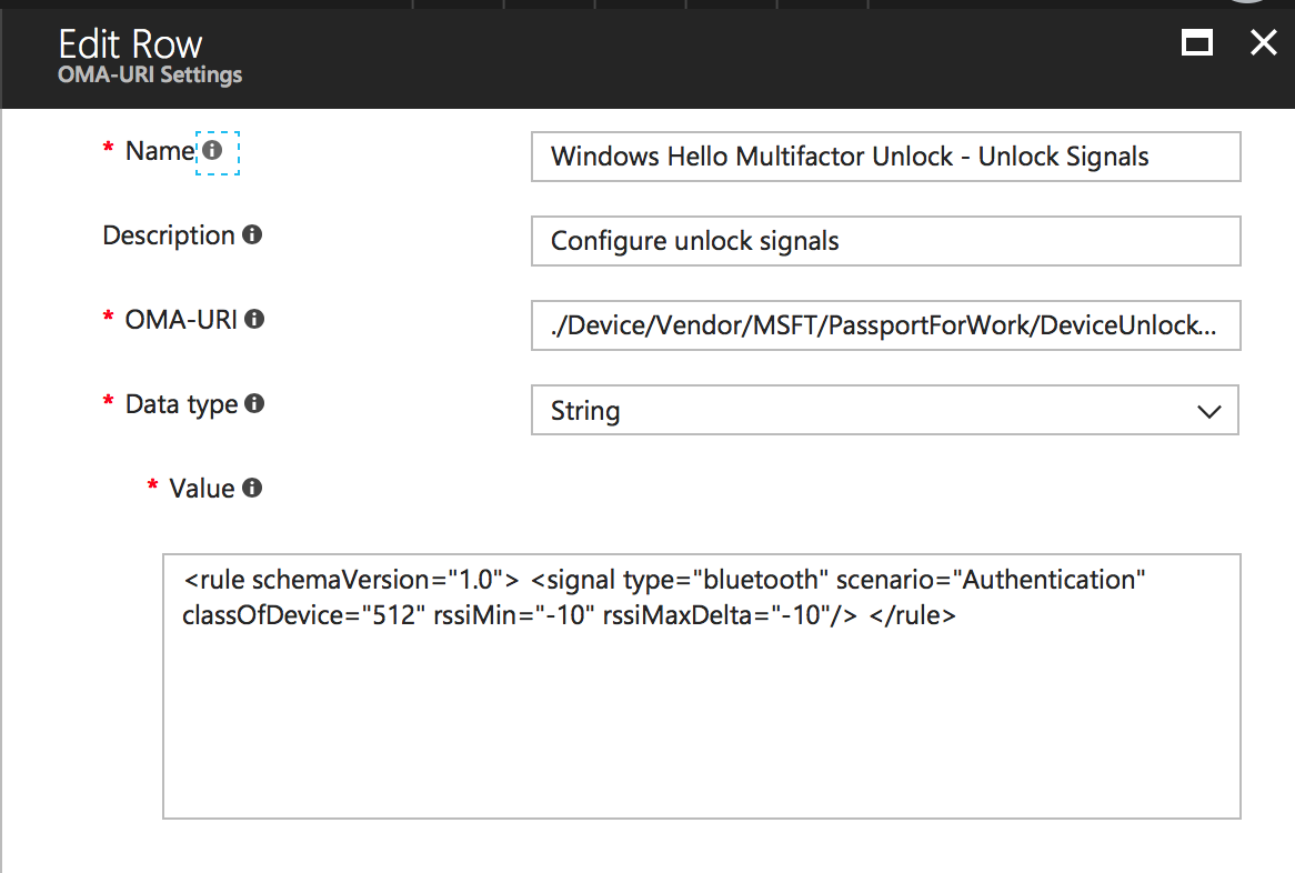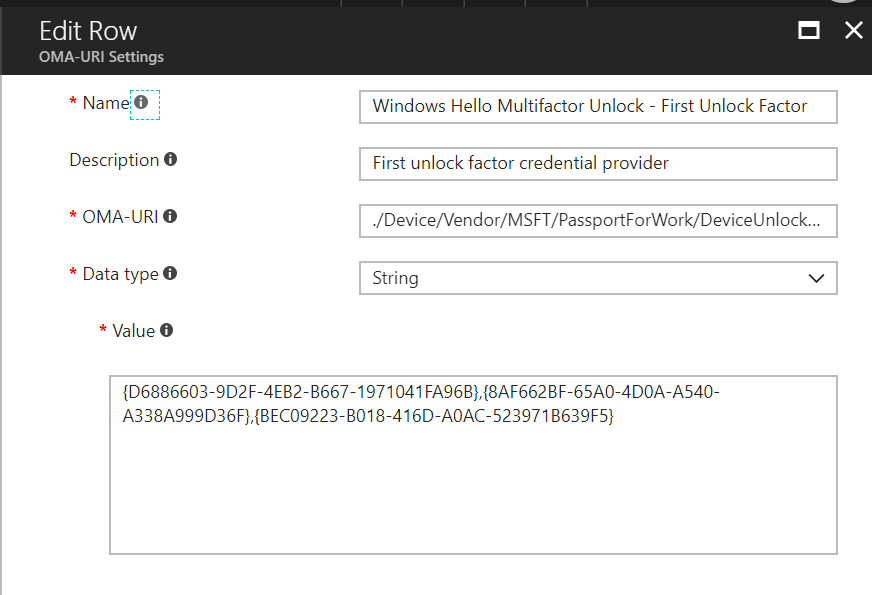 As explained Windows Hello Multifactor Device Unlock consists of 3 components which will be configured each using a custom OMA-URI policy setting, as the configuration can’t be done (yet) using the Intune UI.