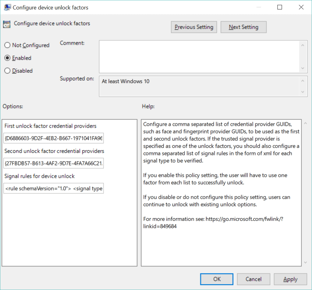 First unlock factor credential provider and Second unlock credential provider are responsible for the bulk of the configuration. Each of these components contains a globally unique identifier (GUID) that represents a different Windows credential provider. With the policy setting enabled, users unlock the device using at least one credential provider from each category before Windows allows the user to proceed to their desktop.