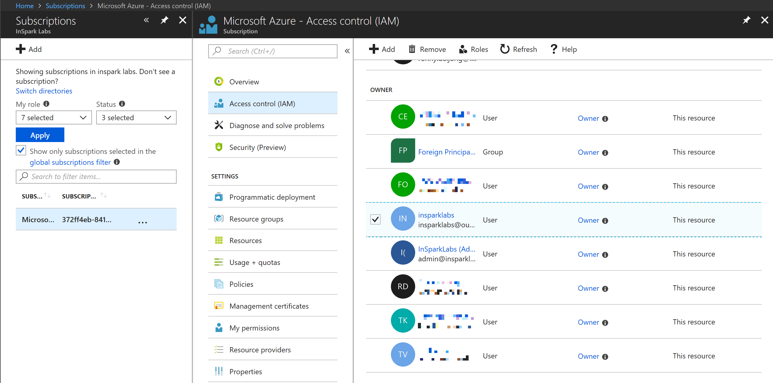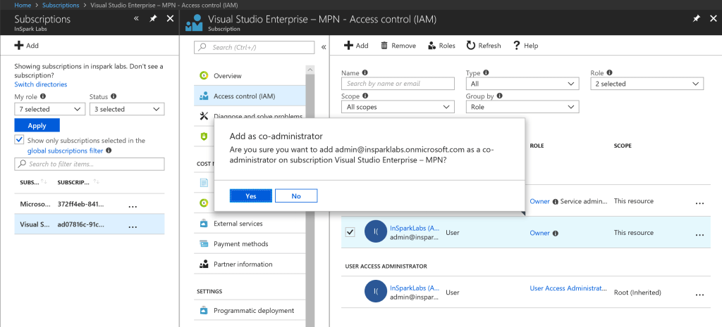 - Next step is to grant Azure AD admin account (A) permissions (owner & co-administrator) to Azure Visual Studio subscription (B).