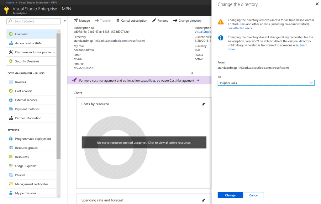 - Change associated directory (InSparkLabsoutlook.onmicrosoft.com) of Visual Studio subscription (B) to new Azure AD tenant (A) insparklabs.onmicrosoft.com.