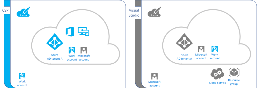 In essence we need to create resources in the Visual Studio subscription (grey – right) with an account sourced from the Azure default AD tenant (light blue – left) associated to the CSP subscription.