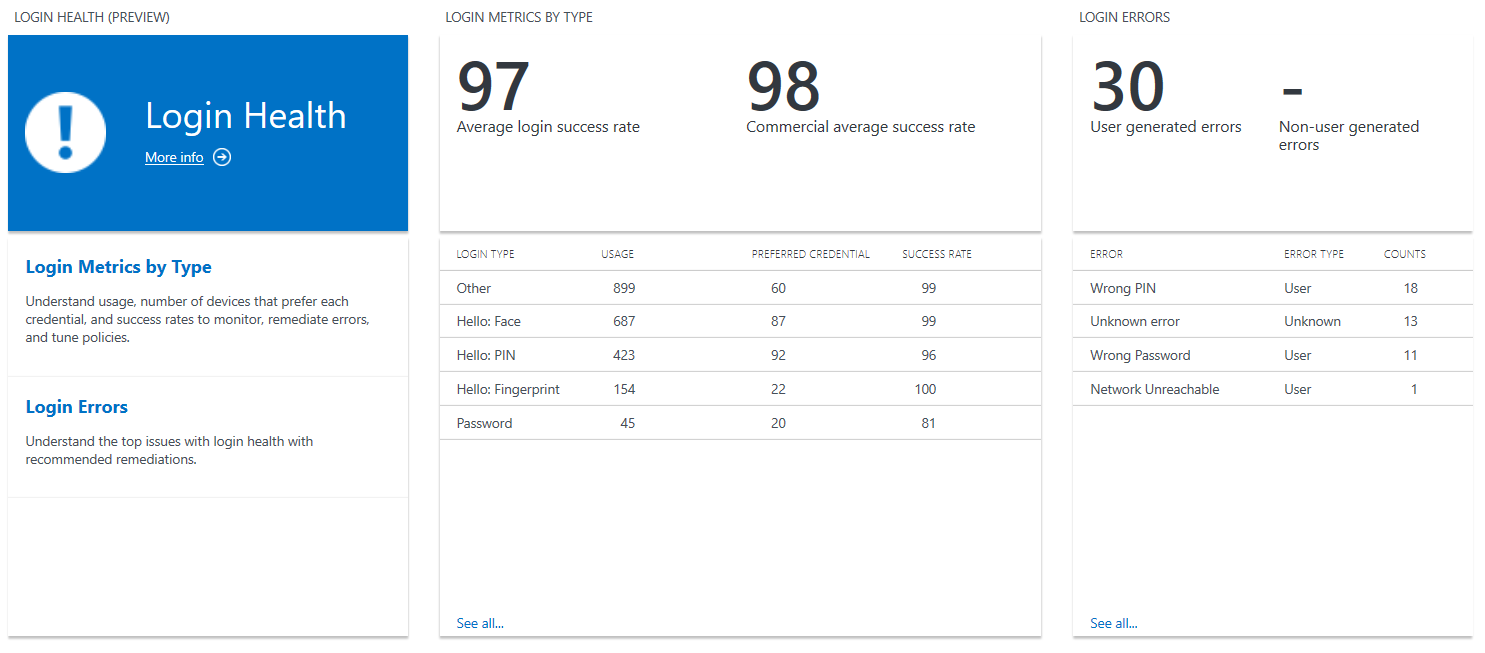 A great way to keep track of your password replacement adoption is Login Health (preview) solution of Windows Analytics (Azure Log Analytics). It provides a clear overview which login types being used, the usage and success rate. The figures below proves Windows Hello (Fingerprint, Face, & Iris recognition) are more convenient to your users giving the success rate.