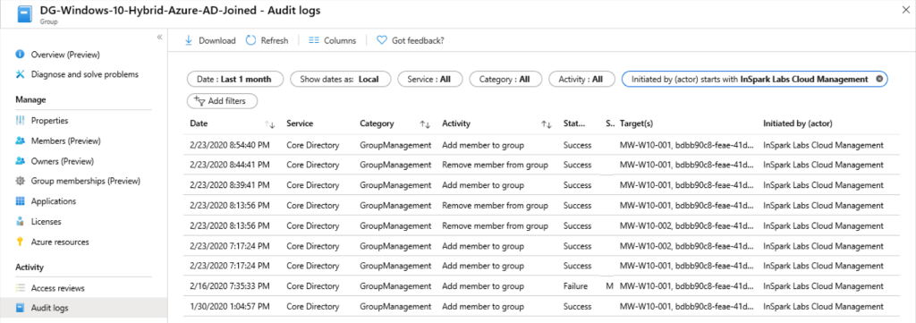 The web app configured as part of the Cloud Management configuration should be assigned as Owners of the Azure AD Security group(s) which will be filled with devices based on the linked collection(s). Use the Audit logs to determine whether the web app has assigned the correct permissions to perform device adds- or deletions.