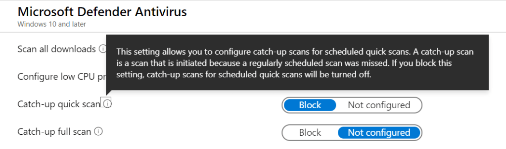 Based on the Microsoft Endpoint Manager UI and provided outline, Not configured implies a catch-up scan is enabled. If you set Block catch-up scan will be turned off. However, in practice this appeared to be the exact opposite. A block results in a $False which effectively enables the catch-up scan, which is confusing and might lead to unintentional configuration(s)