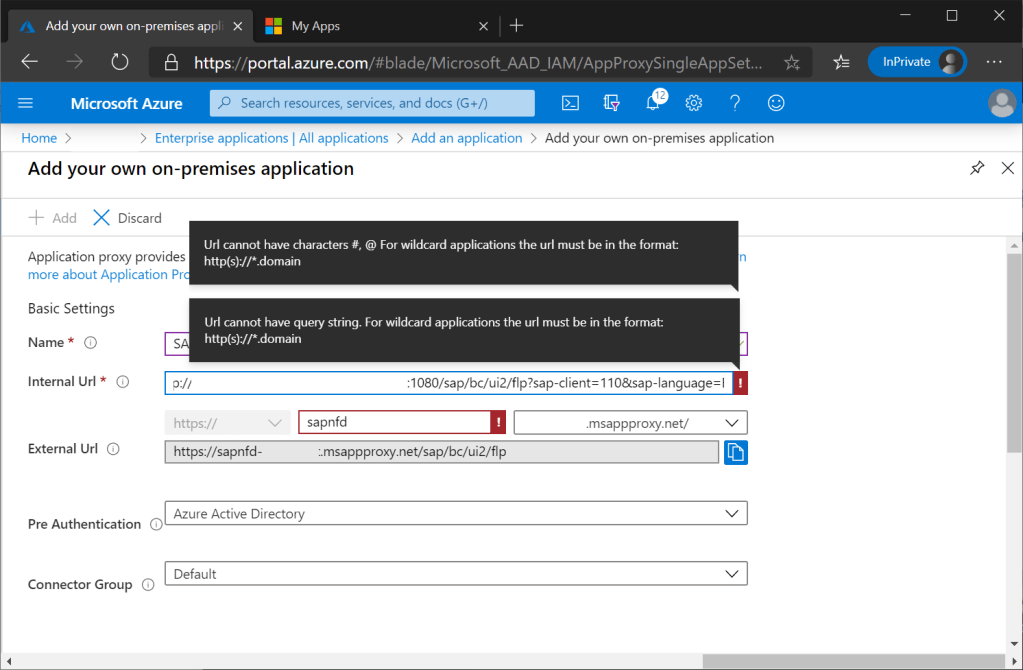The challenge we’d to overcome is to publish the application with it’s full-path internal URL including special characters and query string. By default Azure AD Application Proxy wizard enforces you to respect prerequisites the internal URL should meet.