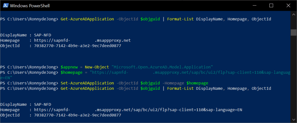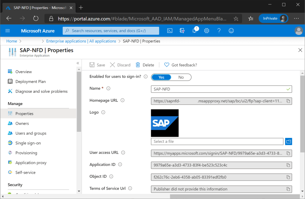 When going back to our Enterprise Application and review it’s properties, it has been updated with the full-path home page URL including special characters.