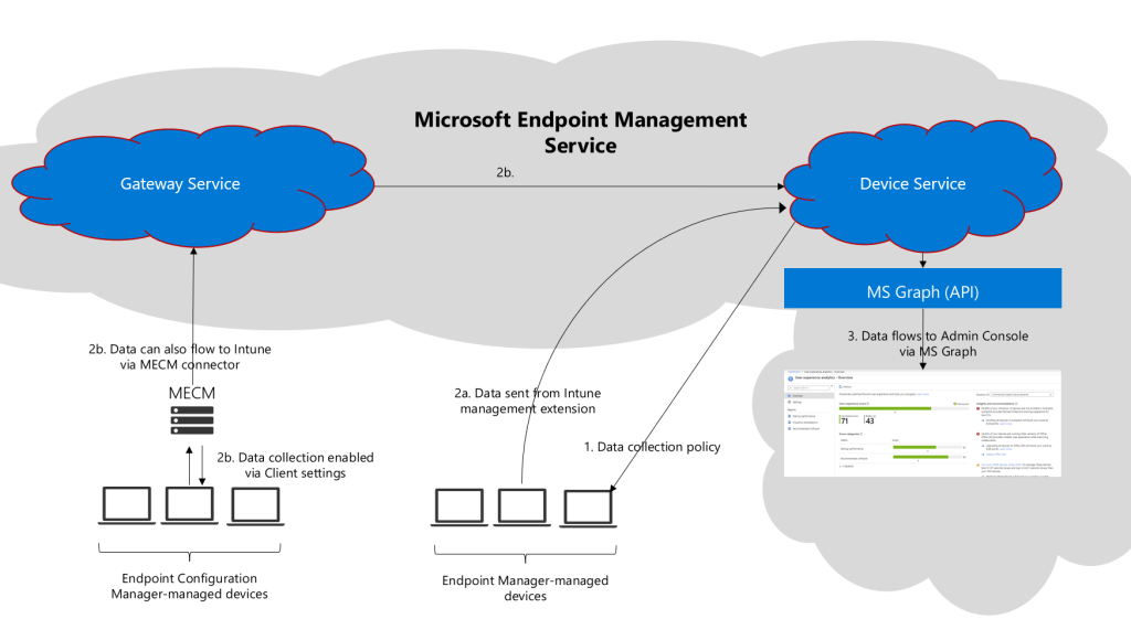 1. The Microsoft Endpoint Management service processes data for each device and publishes the results for both individual devices and organizational aggregates in the admin console using MS Graph APIs.