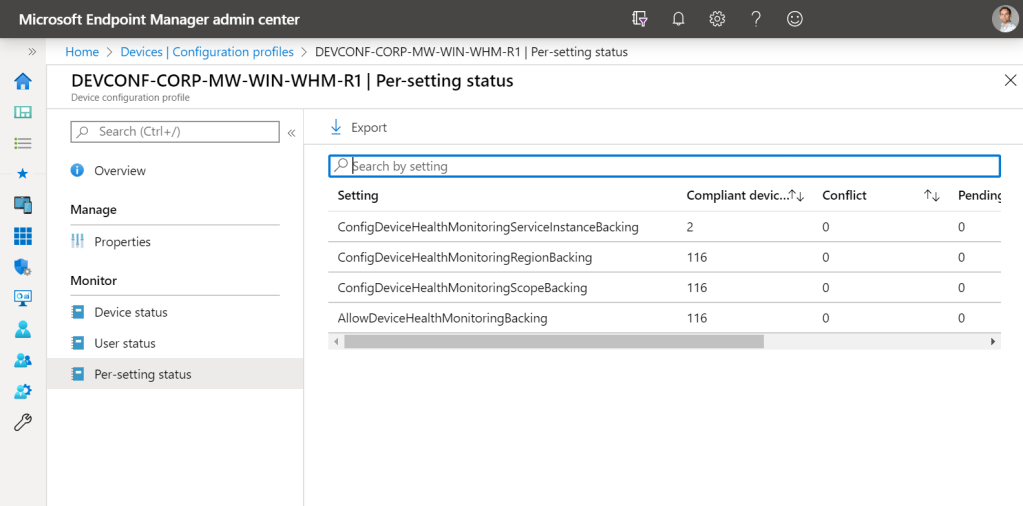 Device Health Monitoring policy which configures endpoints to collect Endpoint Analytics data.